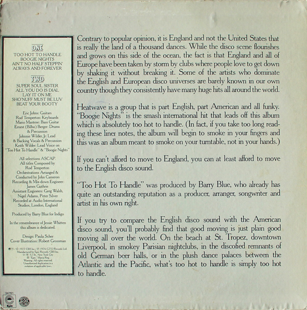 Heatwave 1977 Too Hot To Handle [Epic PE 34761] PRESS US (back)